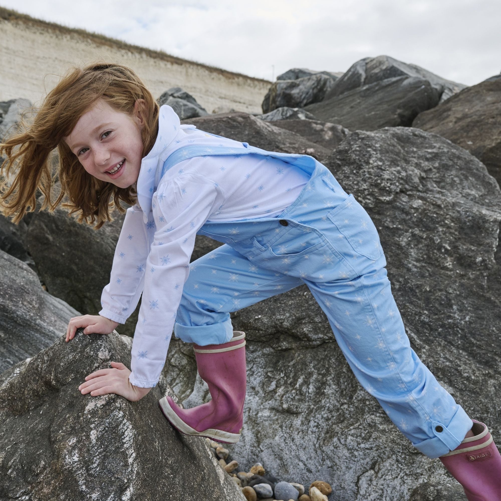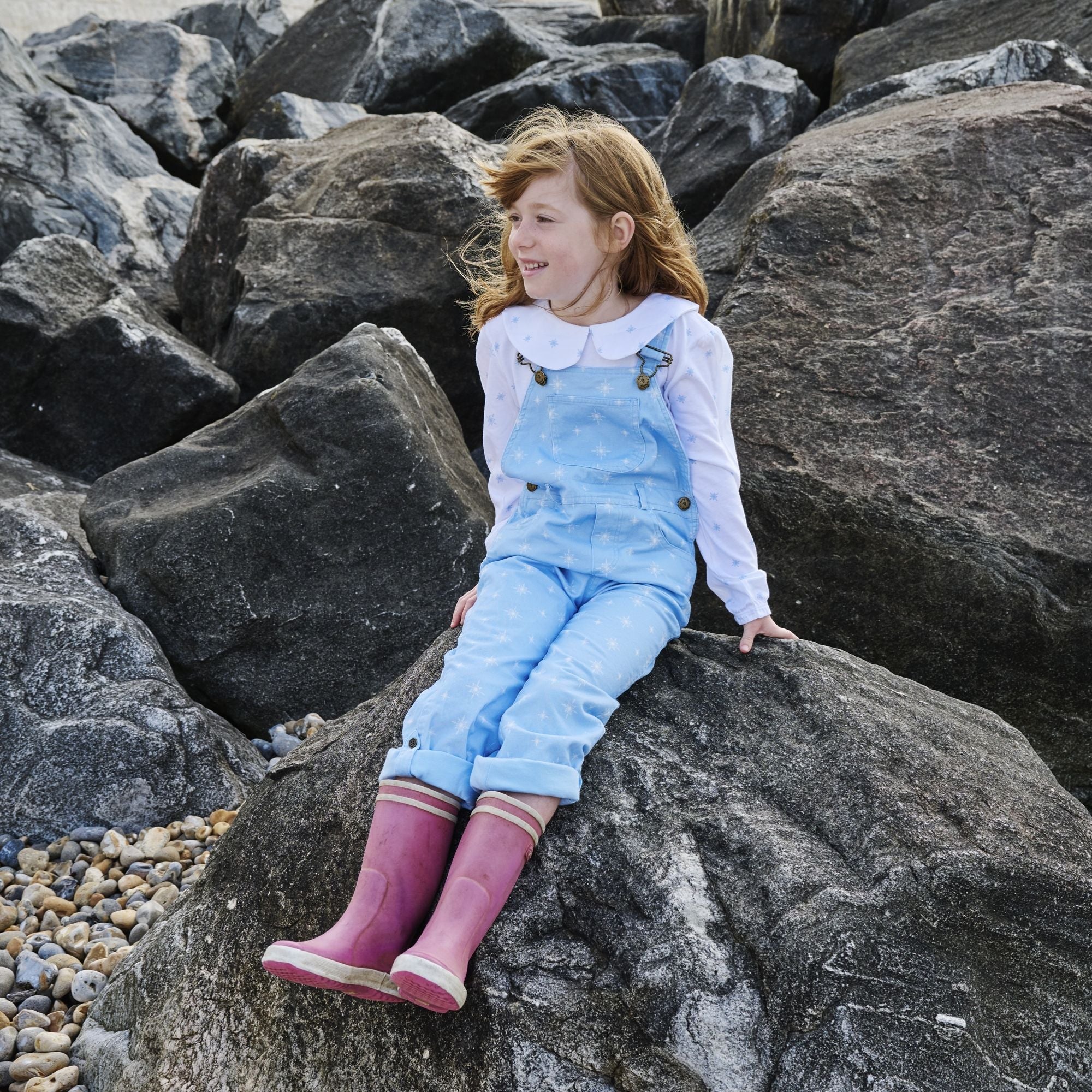 Our best-selling printed brushed denim range is back in our best-selling snowflake print. Inspired by the queen of frost and snow, these beautiful Snowflake Dungarees flew off the shelves with little girls of all ages last year, and are perfect styled with a Peter Pan snowflake top for the complete look.