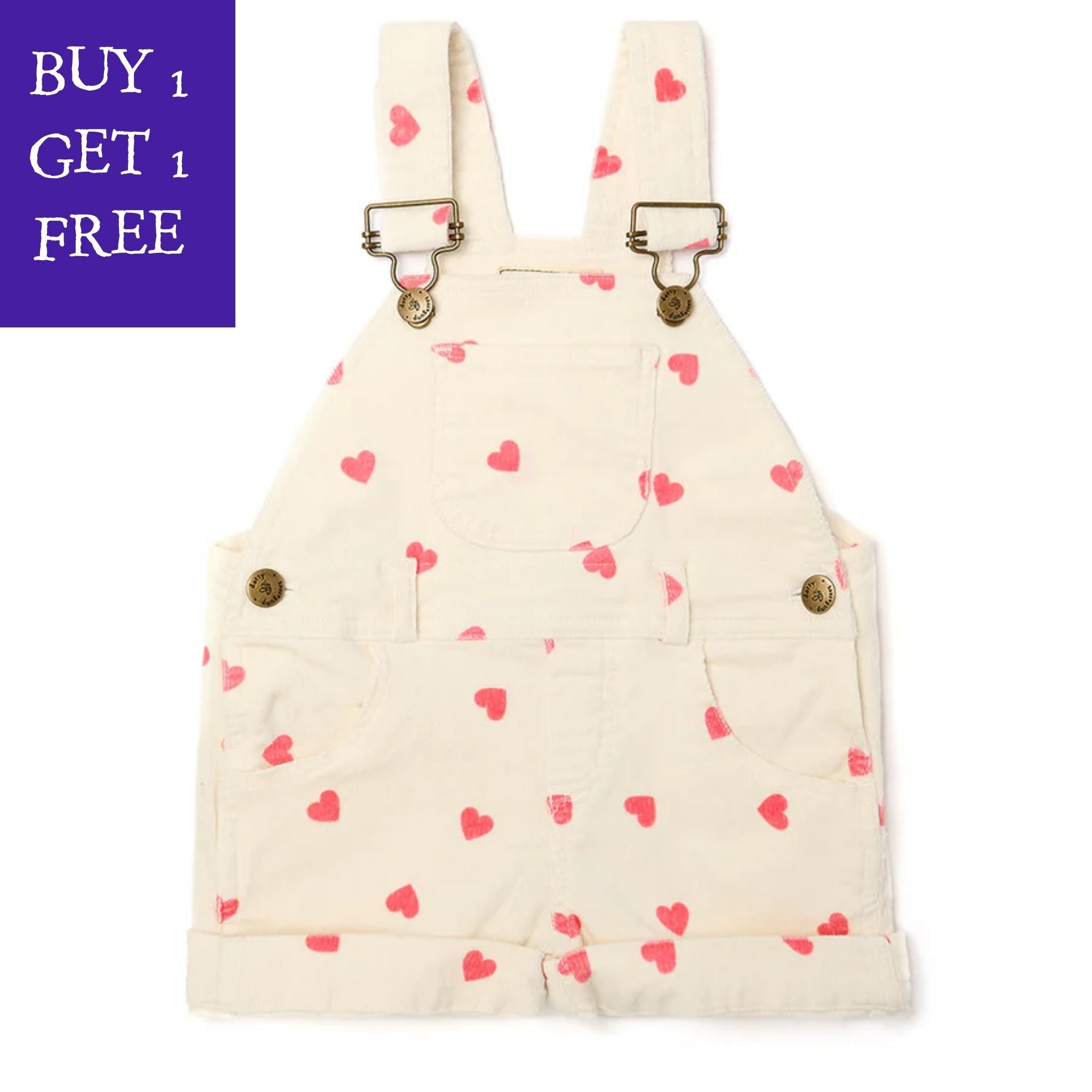 Our first Heart Print dungarees were a total sell out last season and are back again this year in our classic red heart on pink, as well as two new styles: Cream Corduroy with Pink Hearts and Purple Corduroy with Black Hearts.