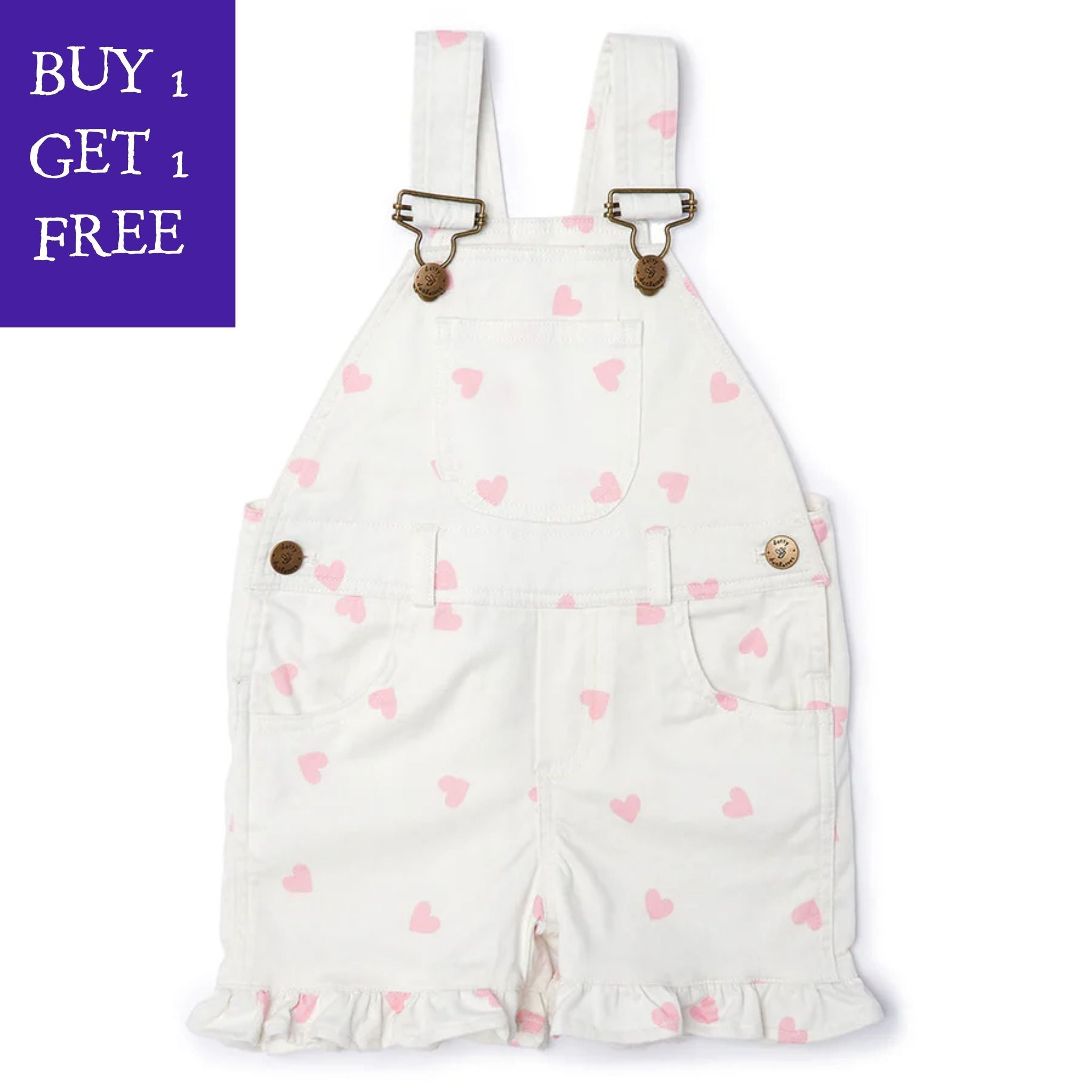 Our first ever printed summer shorts come in the prettiest pink heart print. These adorable dungarees are made of the softest brushed denim with a little frill.