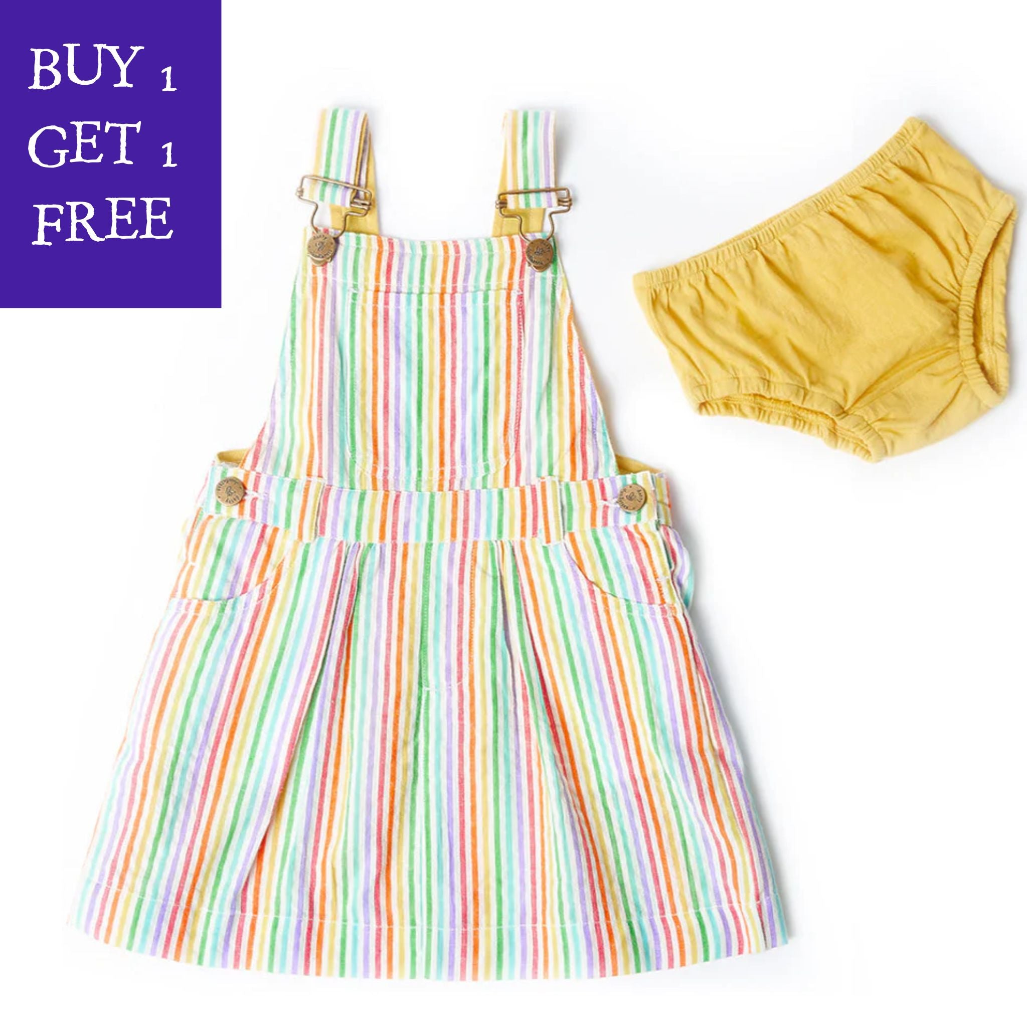 Available in Rainbow and Blue stripes, these adorable seersucker shorts and dresses are 100% cotton with bespoke buttons and buckles. A summer must-have!