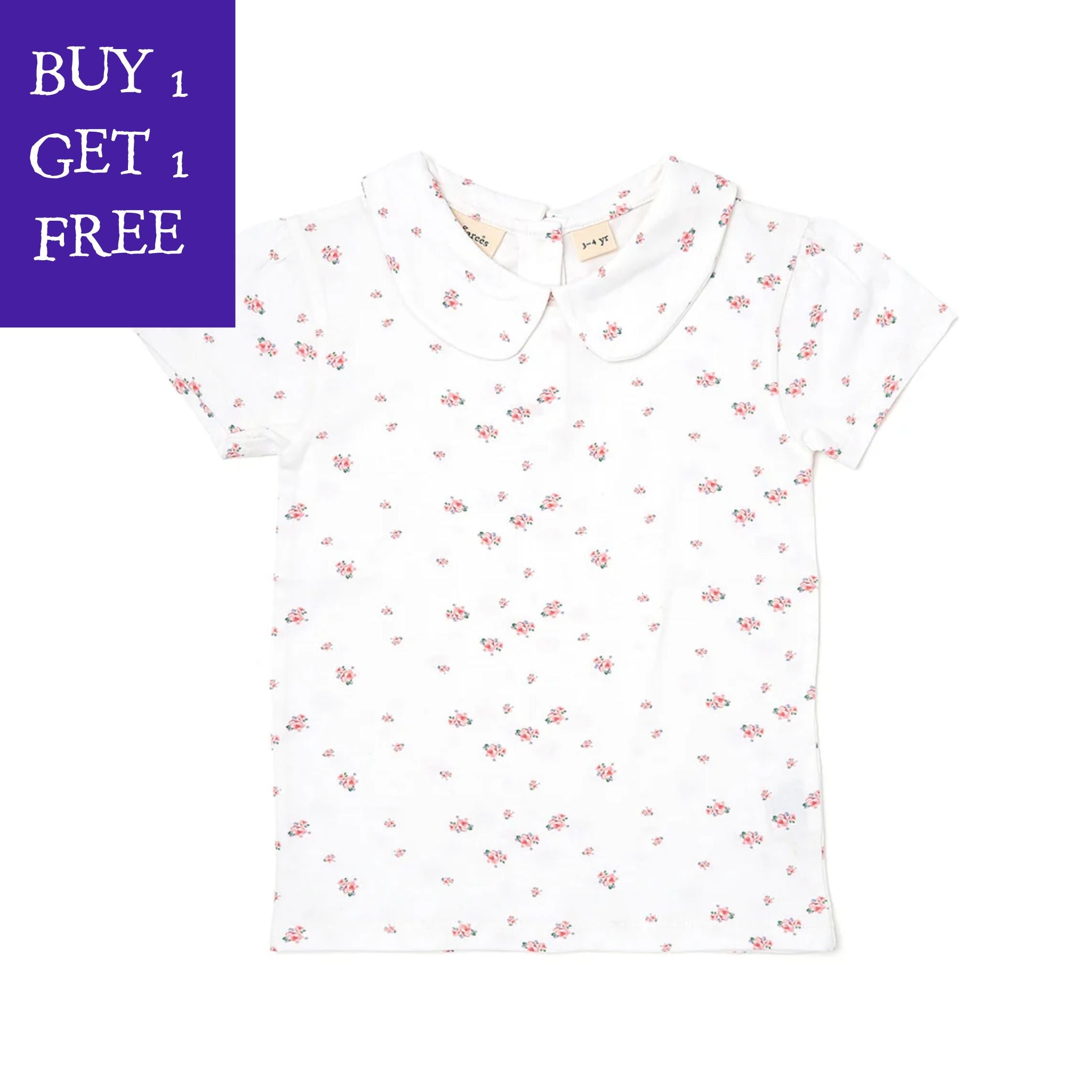 Our short sleeved Peter Pan Collar tees are the sweetest addition to any dotty adventurer's wardrobe. Available in White, Pink Floral, Purple Floral, Pink Hearts and Pink Spots.